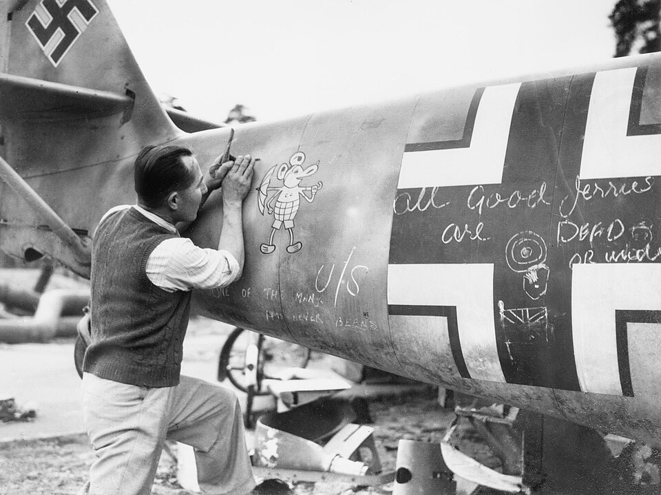 Other subjects such as babies, children, astrological signs, devils, gremlins, etc., also made their way into the aircraft nose art. And so did cartoon characters. What’s more, for cartoon characters, it is not a catastrophe when their noses are within their ears, nor does the following apply, if that were the case: