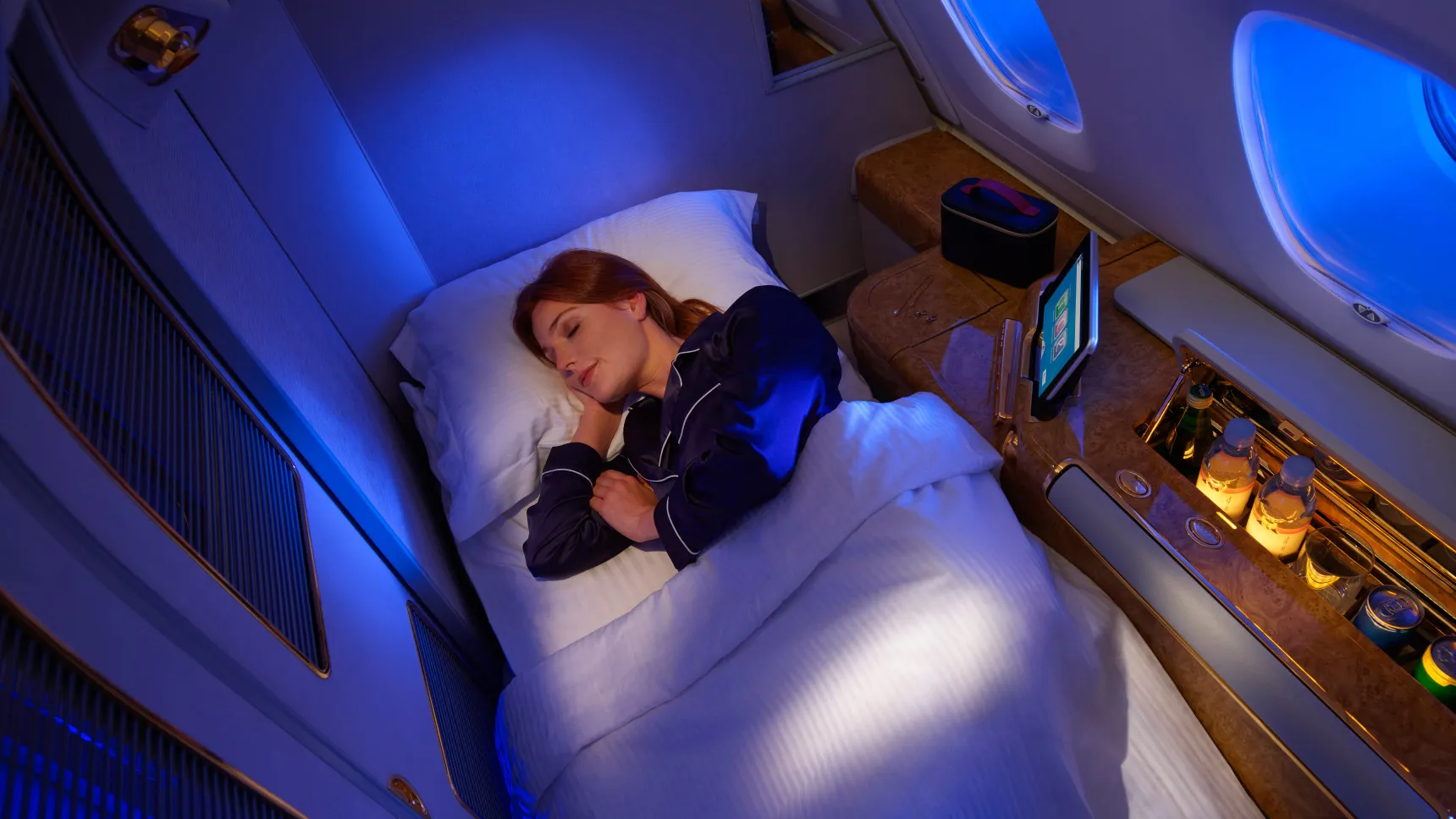 | Storage | Full-height wardrobe, floor-level luggage locker, two small personal storage nooks, and a soft drink cabinet (not refrigerated) | Low-level nook for shoes/personal items; bi-fold table | Seat pocket and tray table |